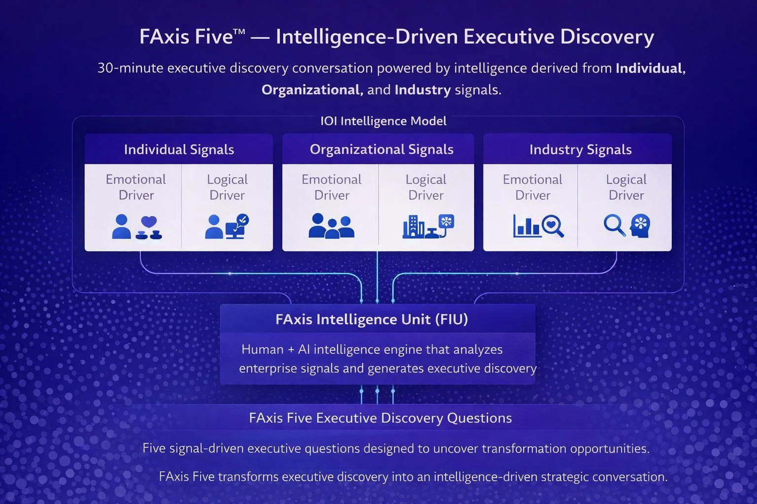 Powered by the FAxis Intelligence Unit (FIU)—a specialized team of human researchers and analysts focused on identifying and validating critical enterprise signals -each session integrates insights from Individual, Organizational, and Industry signals to guide a focused, high-impact executive dialogue.